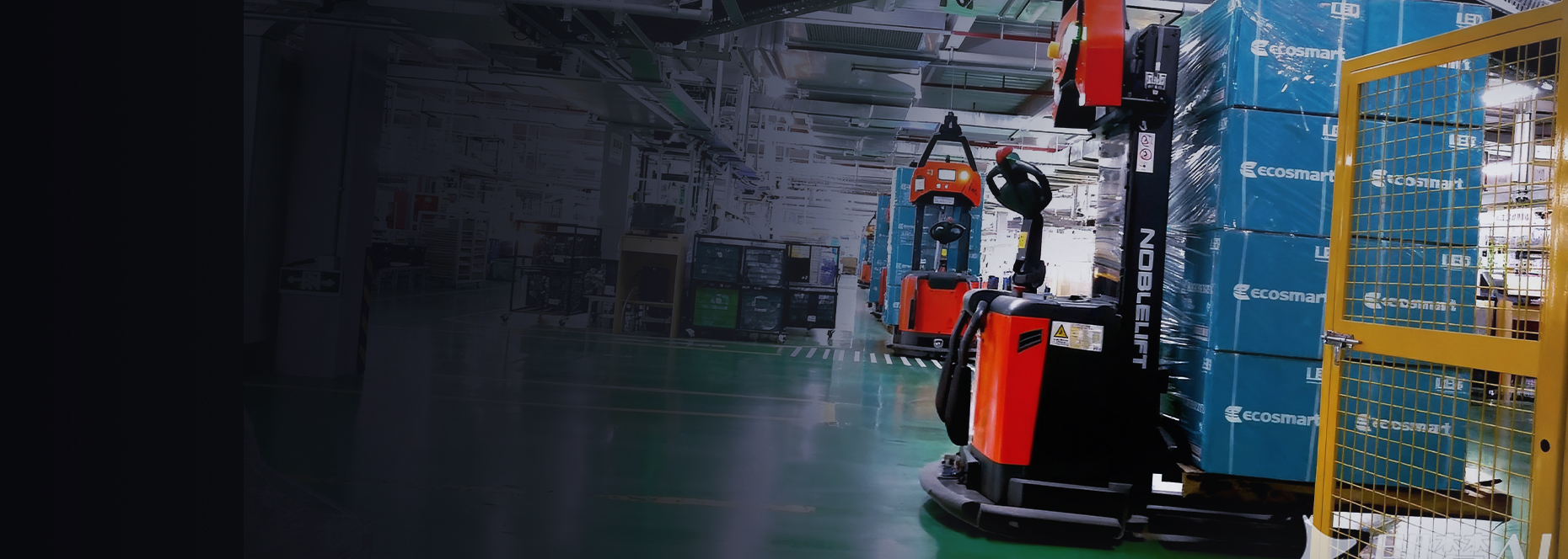 主要是用于照明材料从材料分拣处到产线上料点的物流运输。该项目应用了7台堆垛式叉车AGV,1套库位管理系统等。
