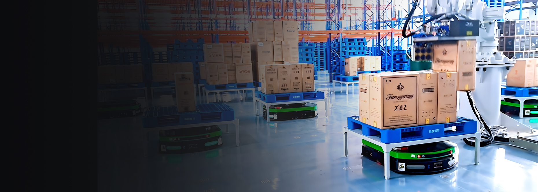 该项目应用了11台二维码潜伏背负举升式AGV、2套自动充电柱 、1套自动叠盘机、1套双机热备软硬件。